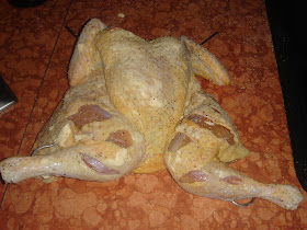 Ez esetben fűszeresebben készítettem, mint az előzőekben bemutatottakat. A gerinccsontjánál átvágott és kiterített, karddal (fém grillnyárssal) kereszt irányban átszúrt, s ezzel kifeszített csirkét fűszereztem. Sóval, borssal, curryvel, füstös fűszerpaprikával (Pimentón de la Vera – magyar fűszerpaprikával helyettesíthető) durvaszemű fokhagyma granulátummal. A bőre alá húsos füstölt szalonna szeleteket és kettőbe vágott fokhagyma gerezdeket dugdostam.